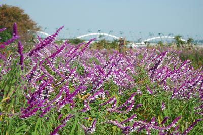 少ないバラを引き立てているのは庭園のほとんどを埋め尽くすアメジストセージ。