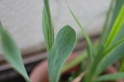 その脇で葉っぱだけがしゃんと伸びる鉢植え。