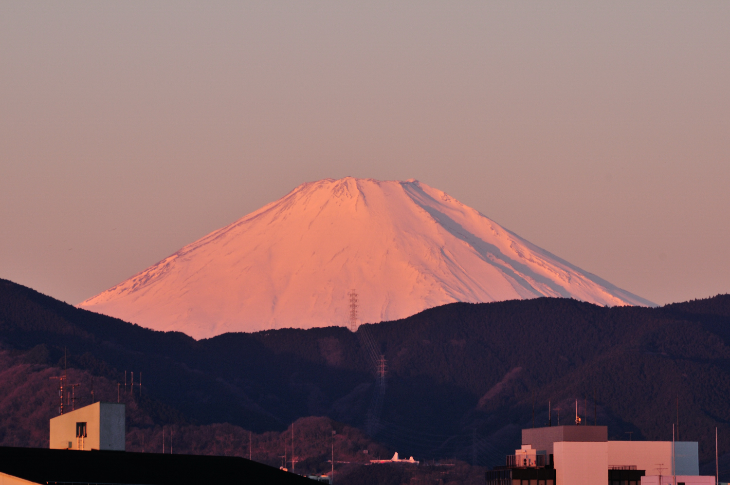 6:45、日の出とともに紅く染まる富士山。