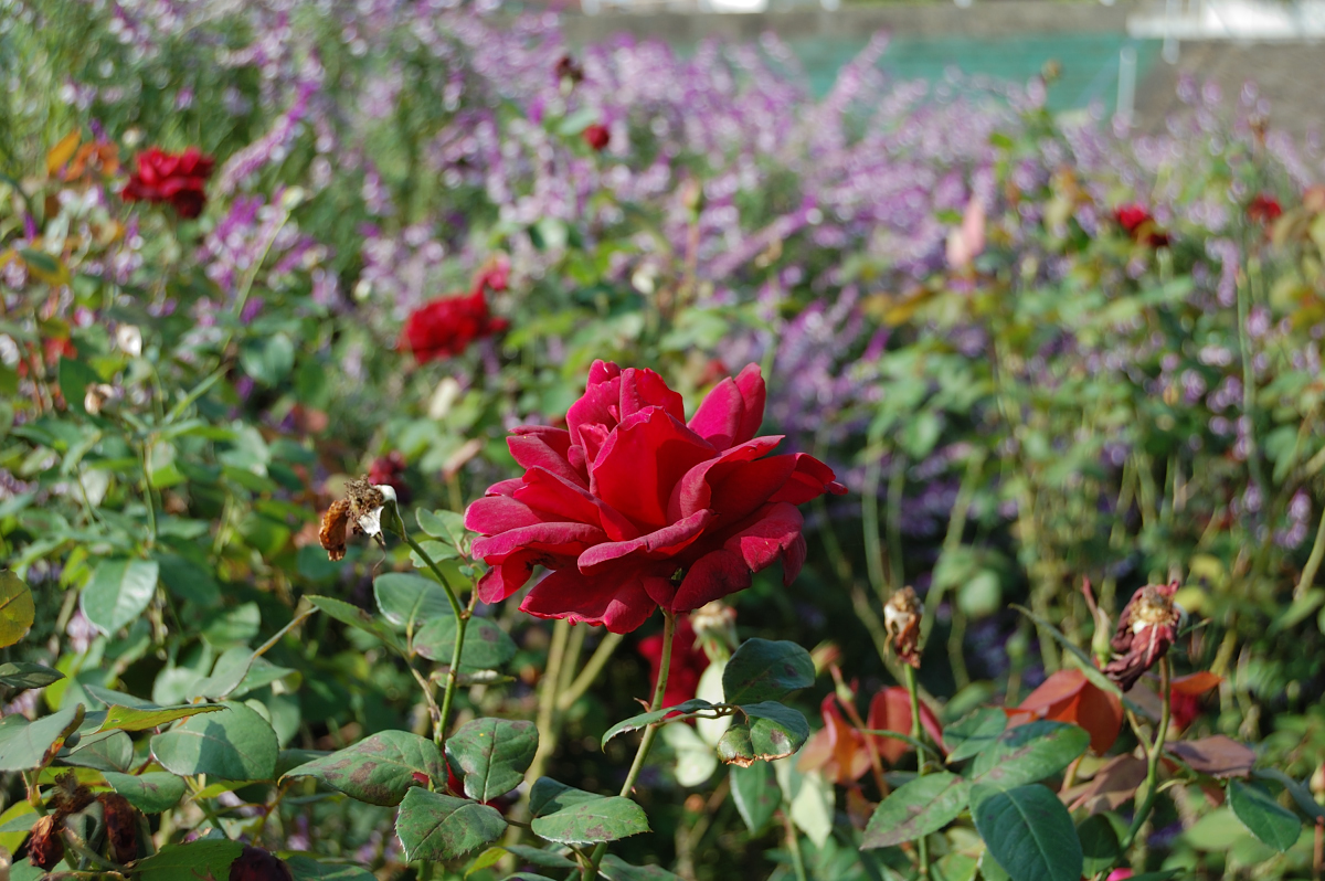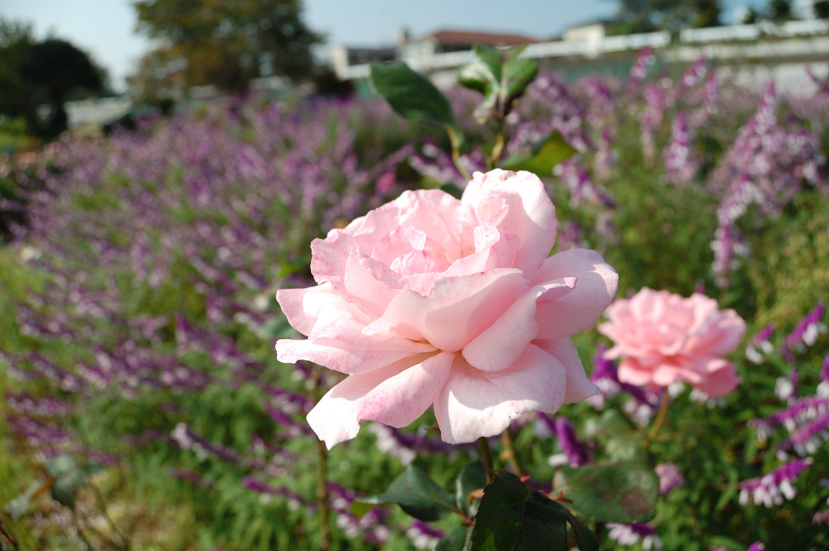 少ないバラを引き立てているのは庭園のほとんどを埋め尽くすアメジストセージ。