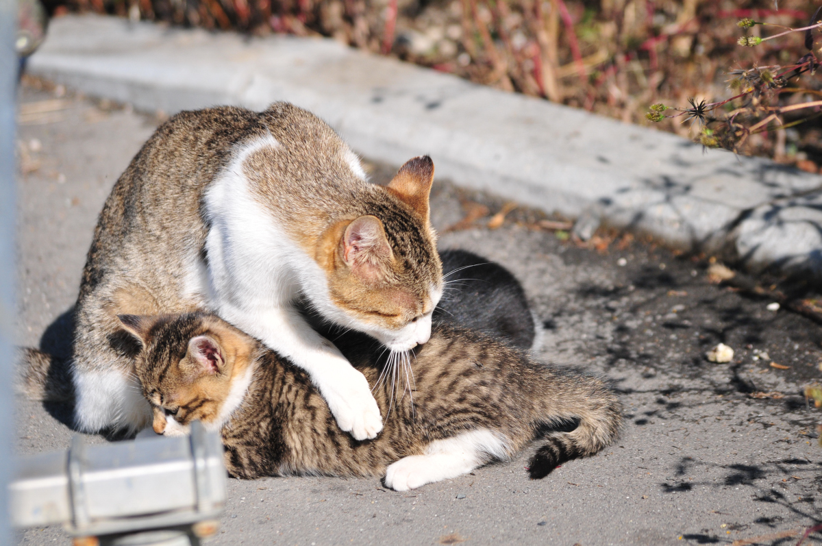 猫が飽きるか、自分が飽きるか。自分が飽きたら猫にそれを伝えないといけないので独自のやり方で「俺は帰るからおまえも縄張りに戻れ」とカラダで示します。
