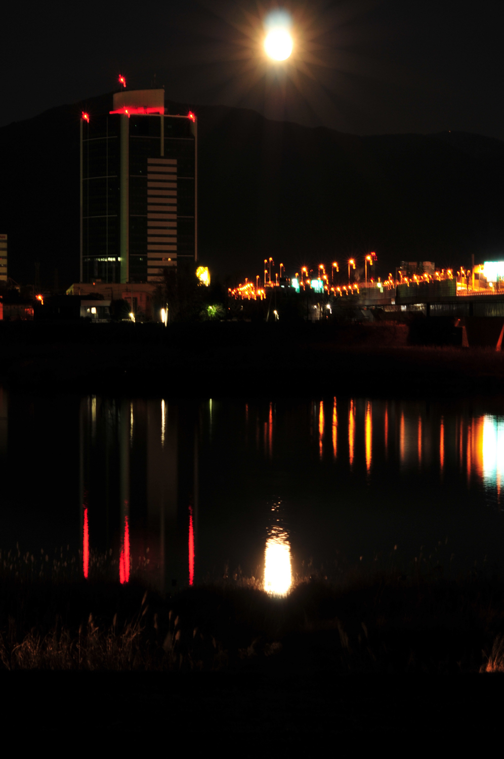 5:41、お役目を終える間際に紅く染まり、川面に明かりを映すお月さん。