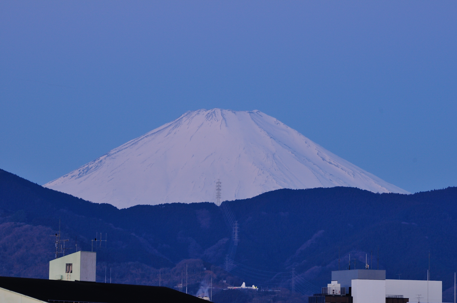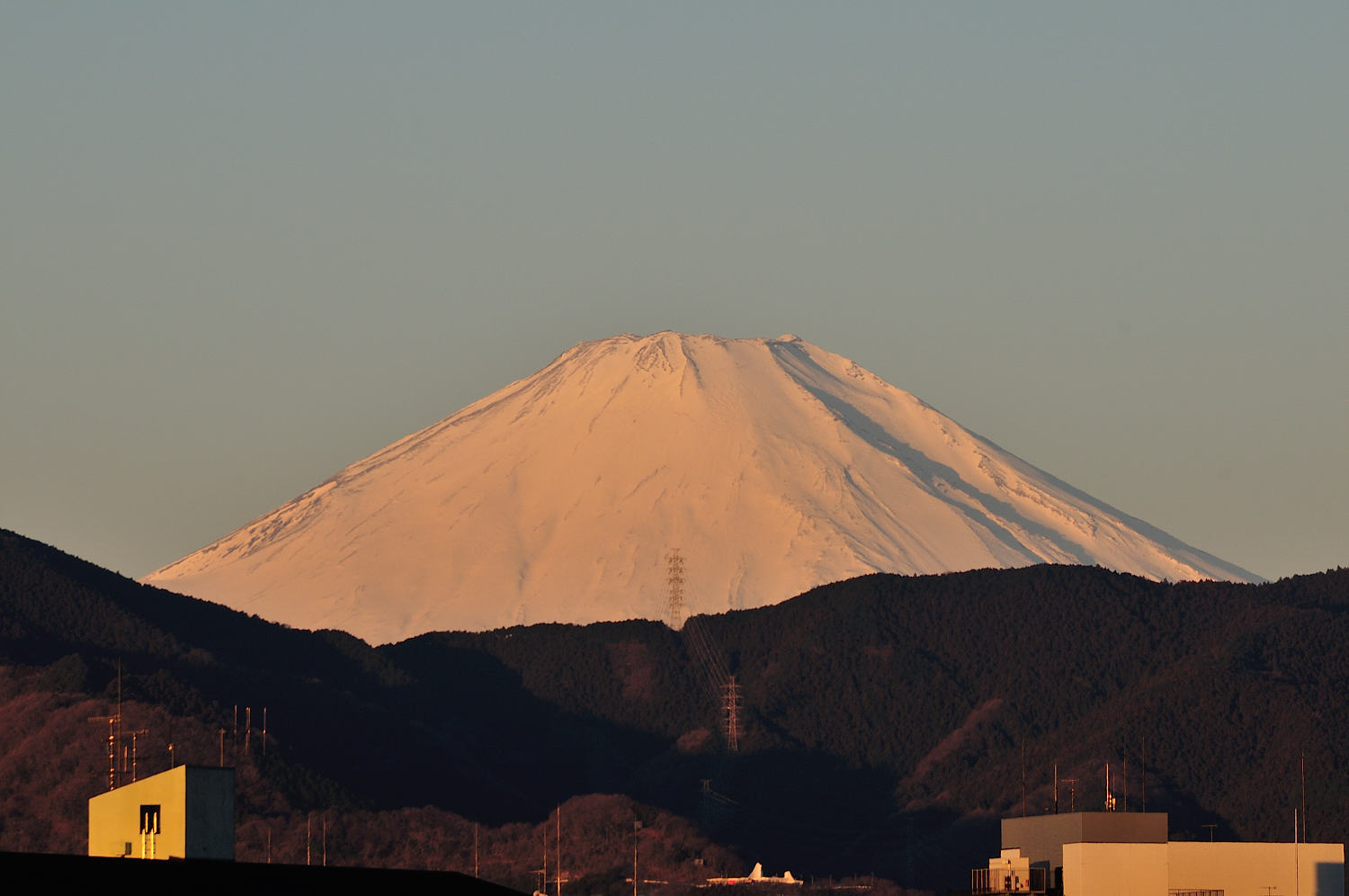 6:45、日の出とともに紅く染まる富士山。