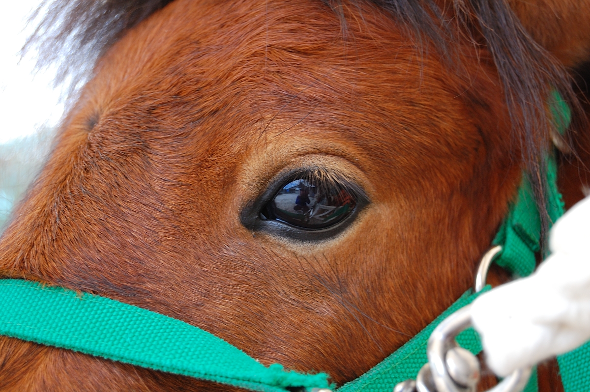 近所の公園にポニーがいます。大きくて優しい眼は見ていて癒されます。大粒のガーネットみたいですね。(その眼に自分が写り込んでました^^;)
